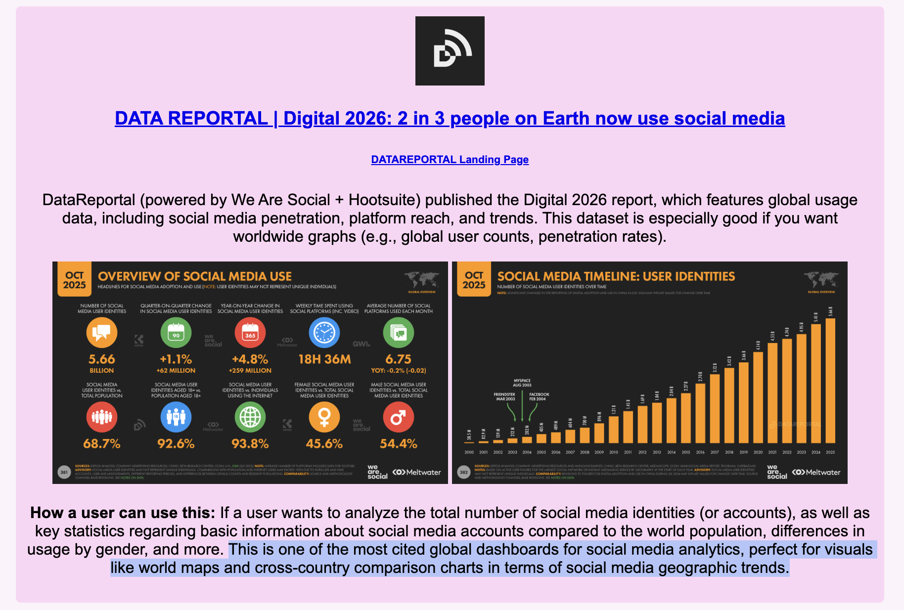 If I was a user searching for basic global statistics on social media usage, I would first enter my website and read the "How a user can use this:" portion to identify which website aligns most with the content I want to research. Upon noticing that the second source, DATAREPORTAL, contains the information I want, I would click the hyperlink to look at their data.
