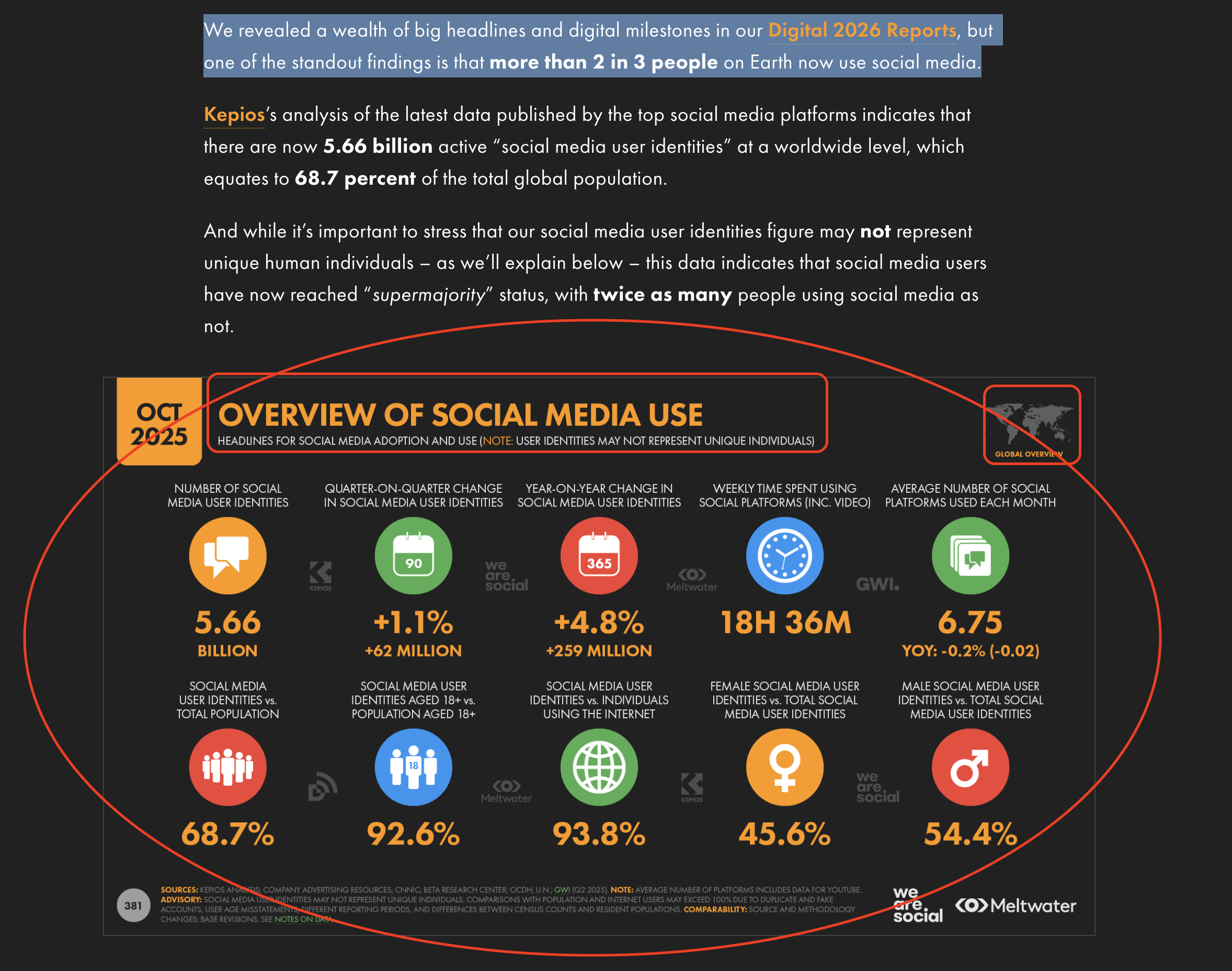 On the DATAREPORTAL website, I can find global statistics easily by viewing the graphs. Even the first graph on the page contains the information I'm looking for, basic social media usage statistics that apply globally.
