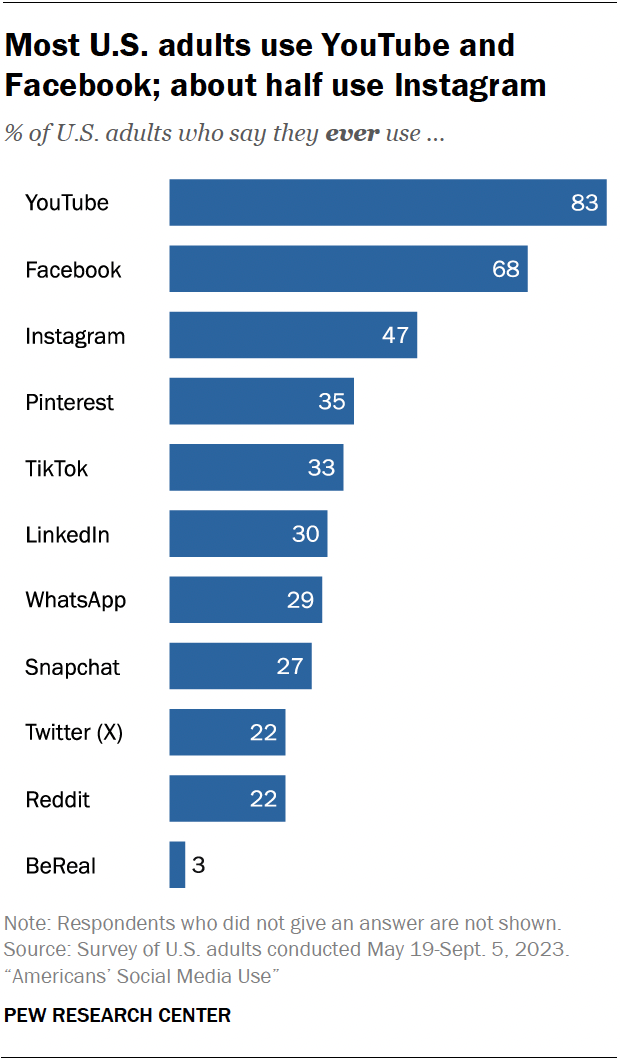 How a user can use this: If a user wants to know whether the percentage of adults who have used a specific social media platform, they can use Pew Research Center's bar charts to identify which platform has had the most adults try it and gauge its popularity.
